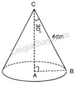 Khi quay tam giác ABC vuông ở A một vòng quanh cạnh góc vuông AC cố định, ta được một hình nón. Biết rằng BC = 4dm, góc ACB = 30o. Tính diện tích xung quanh và thể tích hình nón.