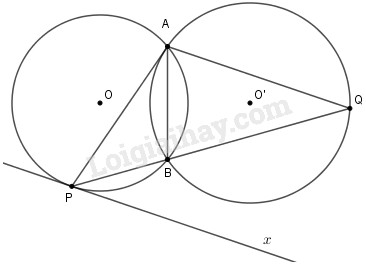 Cho hai đường tròn \((O)\) và \((O’)\) cắt nhau tại \(A\) và \(B\). Tiếp tuyến \(A\) của đường tròn \((O’)\) cắt đường tròn \((O)\) tại điểm thứ hai \(P\). Tia \(PB\) cắt đường tròn \((O’)\) tại \(Q\). Chứng minh đường thẳng \(AQ\) song song với tiếp tuyến tại \(P\) của đường tròn \((O)\).