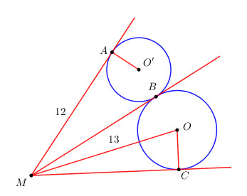 Ở hình dưới, đường tròn (O) và (O’) tiếp xúc ngoài tại B ; MB là tiếp tuyến chung trong của (O) và (O’), MA là tiếp tuyến của (O’), MC là tiếp tuyến của (O). Biết MA = 12, MO = 13. Tính bán kính của đường tròn (O).