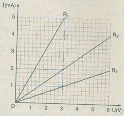 Nhìn vào đồ thị, khi dòng điện chạy qua điện trở có giá trị như nhau thì giá trị hiệu điện thế giữa hai đầu điện trở nào lớn nhất, điện trở đó có giá trị lớn nhất.