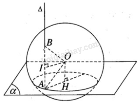 b) Mặt phẳng (ABO) qua tâm O của hình cầu nên cắt mặt cầu theo đường tròn lớn qua A và B. Gọi I là trung điểm của đoạn AB ta có \(\displaystyle OI \bot AB\) . Vì AB // OH nên AIOH là hình chữ nhật.