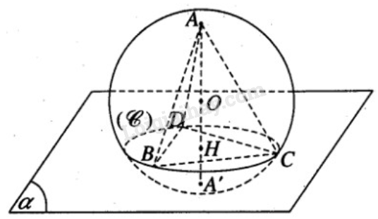 Cho hình cầu đường kính AA’ = 2r. Gọi H là một điểm trên đoạn AA’ sao cho \(AH = {{4r} \over 3}\). Mặt phẳng \((\alpha )\) qua H và vuông góc với AA’ cắt hình cầu theo đường tròn (C).