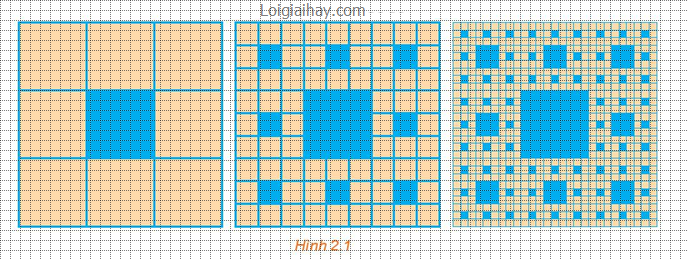 Một hình vuông màu vàng có cạnh 1 đơn vị dài được chia thành chín hình vuông nhỏ hơn và hình vuông ở chính giữa được tô màu xanh như Hình 2.1. Mỗi hình vuông màu vàng nhỏ hơn lại được chia thành chín hình vuông con, và mỗi hình vuông con ở chính giữa lại được tô màu xanh. Nếu quá trình này được tiếp tục lặp lại năm lần thì tổng diện tích các hình vuông được tô màu xanh bao nhiêu?