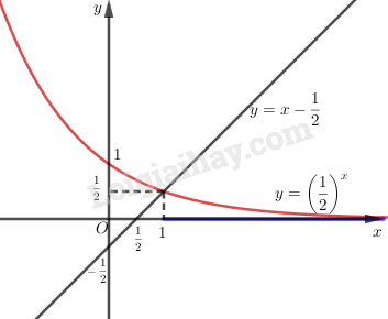 Vẽ đồ thị của hàm số \(\displaystyle y = {\left( {\frac{1}{2}} \right)^x}\) và đường thẳng \(\displaystyle y = x – \frac{1}{2}\) trên cùng một hệ trục tọa độ.
