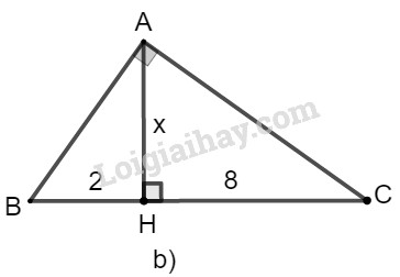 \(AH^2 = HB.HC\) hay \({x^2} = 2.8 = 16 \Rightarrow x = 4\)
