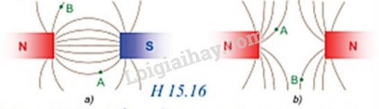 Hình H15.16 biểu diễn hai trường hợp từ trường giữa các cực của hai nam châm thẳng đặt gần nhau. Hãy vẽ thêm chiều của các đường mô tả từ trường và vẽ các kim nam châm đặt tại các vị trí A, B, ghi chú rõ tên cực từ của các kim nam châm này.