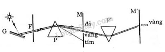 – Cho chùm sáng màu vàng đó khúc xạ qua một lăng kính P’ giống hệ lăng kính P và hứng chùm tia ló trên một màn M’. Kết quả là, vệt sáng trên màn M’ tuy vẫn bị dịch chuyển về phía đáy của P’, nhưng vẫn giữ nguyên màu vàng.