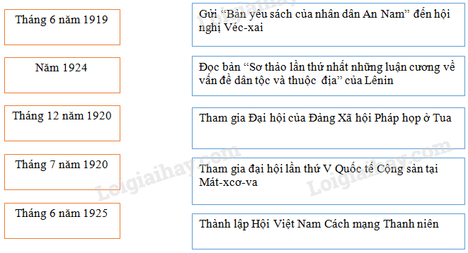 Dựa vào nội dung bài học, em hãy nối mỗi thời gian trong khung màu đỏ với cột sự kiện trong khung màu xanh cho đúng để thấy rõ những hoạt động chính của lãnh tụ Nguyễn Ái Quốc ở nước ngoài trong thời gian từ 1919 đến năm 1925.