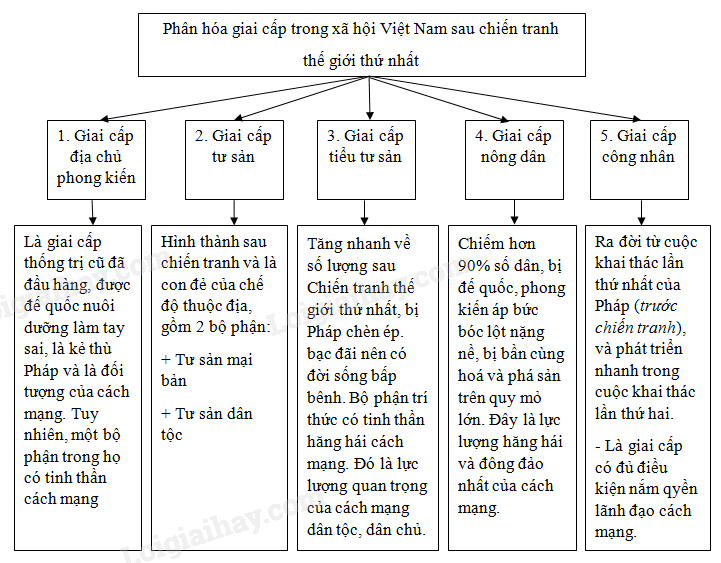 Hãy hoàn thiện sơ đồ sau về sự phân hoá giai cấp trong Xã hội Việt Nam sau chiến tranh thế giới thứ nhất và chỉ rõ thái độ và khả năng cách mạng của từng giai cấp.