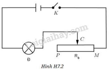 Một bóng đèn sáng bình thường khi có hiệu điện thế U1 = 4,5V. Khi đó cường độ dòng điện qua đèn là I = 0,5A. Đèn được mắc nối tiếp với một biến trở vào nguồn điện có hiệu điện thế U = 12V (hình H7.2). Biến trở có điện trở lớn nhất \(R = 40\Omega \)