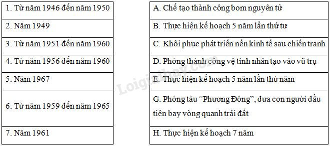 Giải bài tập 2 trang 5 sách bài tập Lịch sử 9. Nối ô bên trái với ô bên phải sao cho phù hợp với nội dung lịch sử Liên Xô