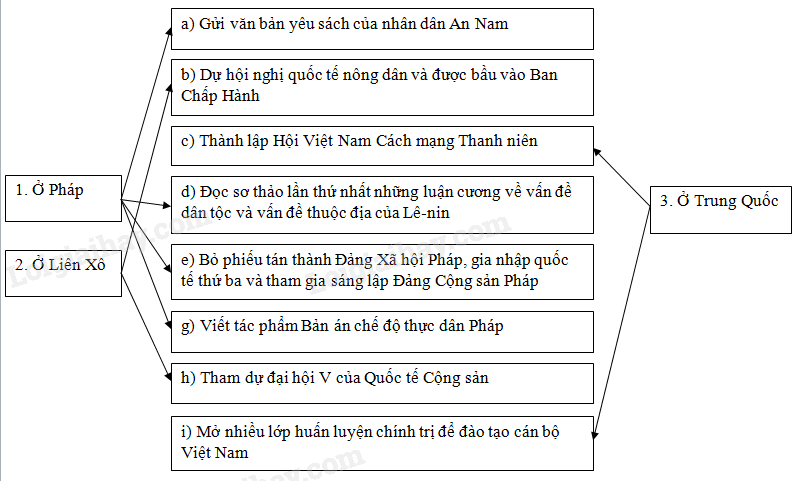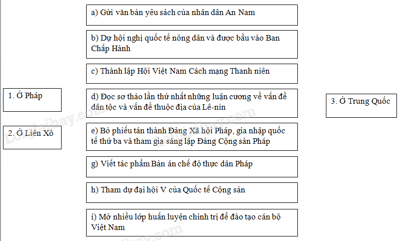 Hãy nối các ô ở giữa với các ô hai bên sao cho phù hợp với quá trình hoạt động tìm đường cứu nước của vị lãnh tụ Nguyễn Ái Quốc.