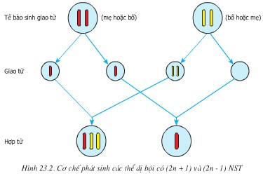 Cơ chế NST dẫn đến sự hình thành thể 3 nhiễm (2n + 1) và thể một nhiễm (2n – 1), là do sự không phân li của một cặp NST tương đồng nào đó ở một phía bố hoặc mẹ. Kết quả tạo một giao tử có cả 2 NST của một cặp (n+1), và một giao tử không mang NST nào của cặp đó (n-1)