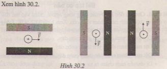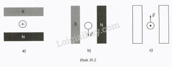 Hãy xác định chiều của lực điện từ, chiều của dòng điện, chiều của đường sức từ và tên cực từ trong các trường hợp biểu diễn trên hình 30.2a,b,c. Cho biết kí hiệu (+) chỉ dòng điện có phương vuông góc với mặt phẳng trang giấy và có chiều đi từ phía trước ra phía sau, kí hiệu (.) chỉ dòng điện có phương vuông góc với mặt phẳng trang giấy và có chiều từ phía sau ra phía trước.