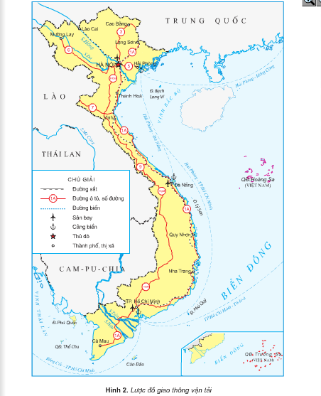 Dựa vào hình 2 và Bản đồ Hành chính Việt Nam, cho biết tuyến đường sắt Bắc – Nam và quốc lộ 1A đi từ đâu đến đâu. Kể tên một số thành phố mà đường sắt Bắc – Nam và quốc lộ 1A đi qua.