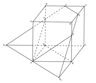 Nối \(B_1E\) cắt \(BB’\) tại \(G\). Nối \(D_1F\) cắt \(DD’\) tại \(K\).
