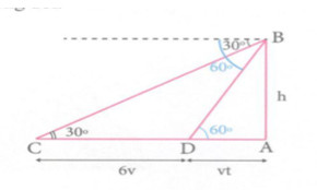 \( \Rightarrow AB = \dfrac{{CD}}{{\cot \widehat {BCA} – \cot \widehat {BDA}}} \)\(\;= \dfrac{{6v}}{{\cot {{30}^o} – \cot {{60}^o}}} = v.3\sqrt 3 \)