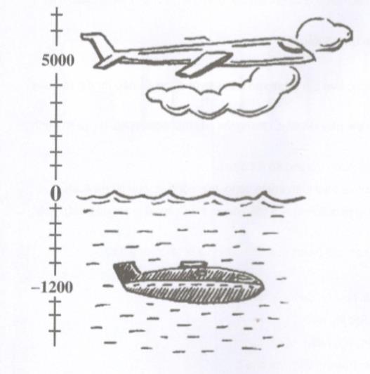 Một máy bay đang bay ở độ cao 5000m trên mực nước biển, tình cờ ngay bên dưới máy bay có một chiếc tàu ngầm đang lặn ở độ sâu 1200m dưới mực nước biển. Tính khoảng cách theo chiều thẳng đứng giữa máy bay và tàu ngầm.