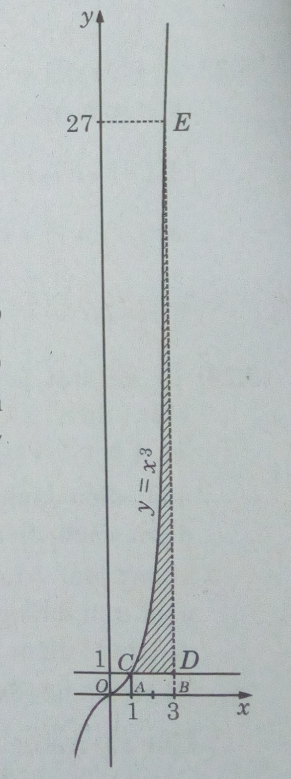 Thể tích vật thể tròn xoay sinh ra bởi miền CED quay quanh trục Ox là hiệu của hai thể tích (V1 và V2) của hai vật thể tròn xoay tương ứng sinh ra khi miền ACEB và miền ACDB quay quanh trục Ox. Như vậy  V = V1 – V2 , trong đó :