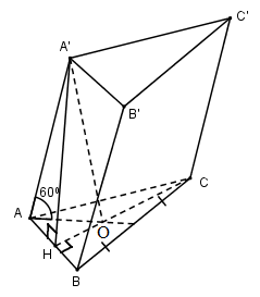 Cho khối lăng trụ tam giác \(ABC.A’B’C’\) có đáy là tam giác đều cạnh \(a\), điểm \(A’\) cách đều ba điểm \(A, B, C\), cạnh bên \(AA’\) tạo với mặt phẳng đáy một góc \(60^0\).