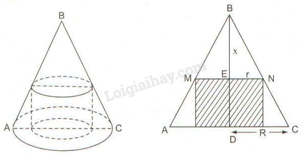 Gọi bán kính đáy hình nón là \(R\), chiều cao hình nón là \(h\), bán kính đáy hình trụ là \(r\), chiều cao phần hình nón cắt đi là \(BE = x\).