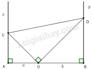 Cho ba điểm \(A, O, B\) thẳng hàng theo thứ tự đó, \(OA=a, OB=b\) (\(a, b\) cùng đơn vị: \(cm\)). Qua \(A\) và \(B\) vẽ theo thứ tự các tia \(Ax\) và \(By\) cùng vuông góc với \(AB\) và cùng phía với \(AB\). Qua \(O\) vẽ hai tia vuông góc với nhau và cắt \(Ax\) ở \(C, By\) ở \(D\) (xem hình 84)