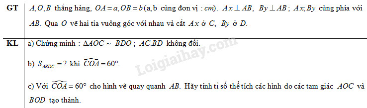 c/ Với \(\widehat {COA} = 60^\circ \) cho hình vẽ quay quanh \(AB\). Hãy tính tỉ số thể tích các hình do các tam giác \(AOC\) và \(BOD\) tạo thành.