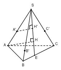 Suy ra \({V \over {V’}} = {{{V_{A.SBC}}} \over {{V_{A’.SB’C’}}}} = {{{1 \over 3}{S_{SBC}}.AH} \over {{1 \over 3}{S_{SB’C’}}.A’H’}} = {{SA} \over {SA’}}.{{SB} \over {SB’}}.{{SC} \over {SC’}}\)