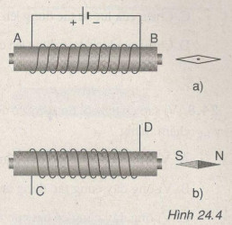 a. Cực nào của kim nam châm trong hình 24.4a hướng về phía đầu B của cuộn dây điện?