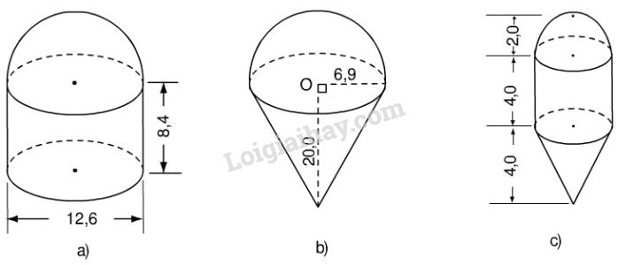 a) Thể tích hình cần tính gồm một hình trụ có bán kính đáy \(R=12,6:2=6,3,\) chiều cao \(h=8,4\) và nửa hình cầu có bán kính  \(R=12,6:2=6,3.\)