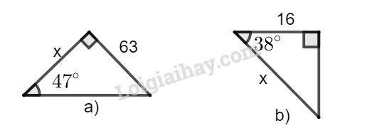 Ta có: \(\tan47^\circ  = \dfrac{{63}}{x}.\) Suy ra: \(x = \dfrac{{63}}{ {\tan47^\circ }} \approx \dfrac{{63}}{{1,072}} \approx 58,769\)