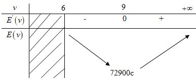 Đạo hàm \(E’\left( v \right) = 300c.{{3{v^2}\left( {v – 6} \right) – {v^3}} \over {{{\left( {v – 6} \right)}^2}}}\) \( = 300c.{{2{v^3} – 18v} \over {{{\left( {v – 6} \right)}^2}}} = 600c.{{{v^2}\left( {v – 9} \right)} \over {{{\left( {v – 6} \right)}^2}}}\)