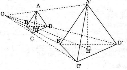 \(\begin{array}{l}\frac{{{V_{A’B’C’D’}}}}{{{V_{ABCD}}}} = \frac{{\frac{1}{3}{S_{B’C’D’}}.A’H’}}{{\frac{1}{3}{S_{BCD}}.AH}}\\ = \frac{{{S_{B’C’D’}}.A’H’}}{{{S_{BCD}}.AH}}\\ = \frac{{\frac{1}{2}B’C’.B’D’\sin \varphi }}{{\frac{1}{2}BC.BD\sin \varphi }}.\frac{{A’H’}}{{AH}}\\ = \frac{{B’C’}}{{BC}}.\frac{{B’D’}}{{BD}}.\frac{{A’H’}}{{AH}}\\ = {\left| k \right|^3}\end{array}\)