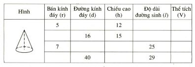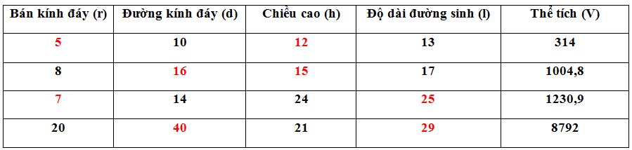 + Dòng thứ nhất: Khi \(r = 5cm;h = 12cm\) ta có