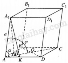\(\eqalign{  & {V_{ABCD.{A_1}{B_1}{C_1}{D_1}}} = AB.AD.\sin \alpha .{A_1}H \cr&= {a^2}.\sin a.{a \over {cos{\alpha  \over 2}}}\sqrt {co{s^2}{\alpha  \over 2} – co{s^2}\alpha }   \cr  &  = 2{a^3}\sin {\alpha  \over 2}\sqrt {co{s^2}{\alpha  \over 2} – co{s^2}\alpha } . \cr} \)