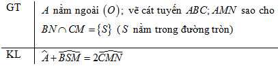 + Số đo của góc có đỉnh bên ngoài đường tròn bằng nửa hiệu số đo hai cung bị chắn.