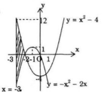 \(S = \int\limits_{ – 2}^1 {\left| {{x^2} – 4 – \left( { – {x^2} – 2x} \right)} \right|dx} \) \( = \int\limits_{ – 2}^1 {\left| {2{x^2} + 2x – 4} \right|dx} \) \( = \left| {\int\limits_{ – 2}^1 {\left( {2{x^2} + 2x – 4} \right)dx} } \right|\)