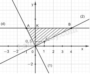 b) Qua điểm K(0;2) vẽ đường thẳng (d) song song với trục Ox. Đường thẳng (d) cắt các đường thẳng (1) , (2) lần lượt tại A, B. Tìm tọa độ của các điểm A, B.
