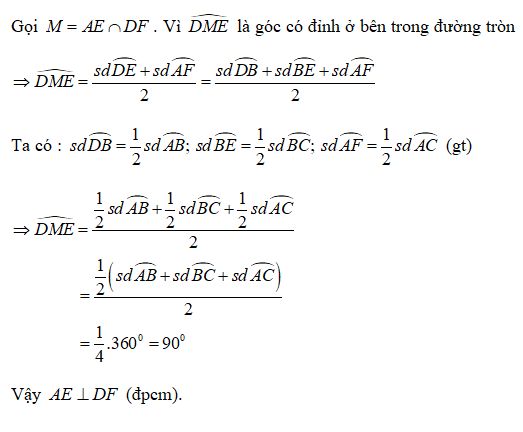 Cho tam giác ABC nội tiếp đường tròn (O). Gọi D, E, F theo thứ tự là điểm chính giữa các cung AB, BC, CA. Chứng minh AE vuông góc với DF.