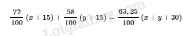 Nếu tăng khối lượng của mỗi loại quặng thêm \(15\) tấn thì được một loại quặng chứa 63,25% sắt, khi đó ta có phương trình: