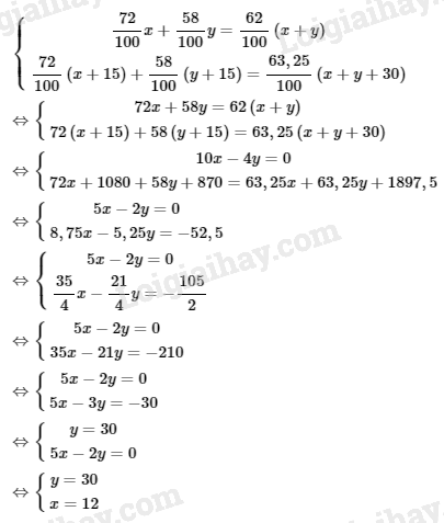 \(\displaystyle{{72} \over {100}}x + {{58} \over {100}}y = {{62} \over {100}}\left( {x + y} \right)\)