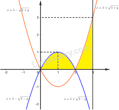 Ta có: \(\displaystyle  {V_y} = \pi \int\limits_0^1 {\left[ {{{\left( {1 + \sqrt {1 – y} } \right)}^2} – {{\left( {1 – \sqrt {1 – y} } \right)}^2}} \right]dy} \) \(\displaystyle   + \pi \int\limits_0^3 {\left[ {{3^2} – {{\left( {1 + \sqrt {1 + y} } \right)}^2}} \right]dy} \)