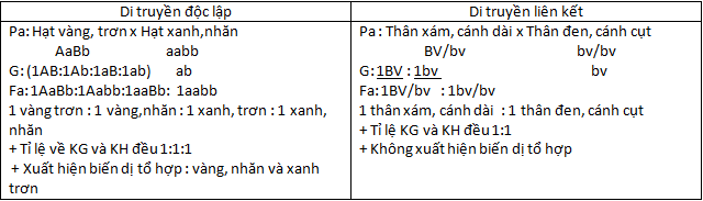 Giải bài tập 3 mục III Củng cố hoàn thiện trang 33 VBT Sinh học 9: So sánh kết quả lai phân tích F1 trong 2 trường hợp di truyền độc lập và di truyền liên kết của 2 cặp tính trạng.