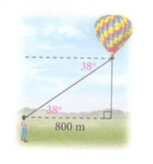 Một người đứng cách nơi thả khinh khí cầu 800 m nhìn thấy nó với góc nghiêng \({38^o}\). Tính độ cao của khinh khí cầu. Cho biết khoảng cách từ mặt đất đến mắt người đó là 1,5 m.
