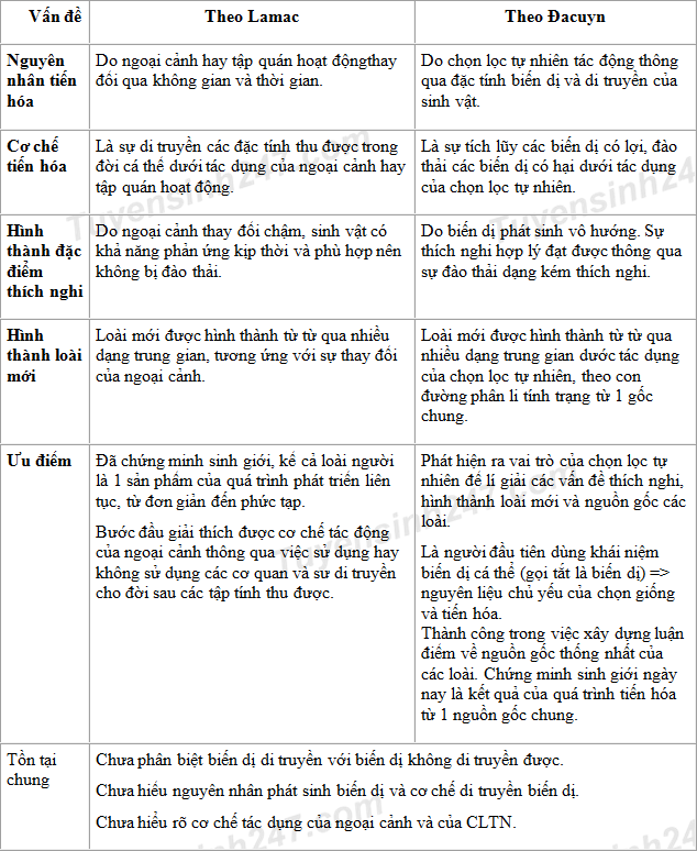 Nêu những khác biệt giữa học thuyết Đacuyn với học thuyết Lamac.