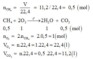 Đốt cháy hoàn toàn 11,2 lít khí metan. Hãy tính thể tích khí oxi cần dùng và thể tích khí cacbonic tạo thành.