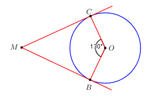 Ở hình dưới, biết MB, MC là hai tiếp tuyến của đường tròn (O) tại B và C, \(\widehat {COB} = {130^o}\). Tính số đo góc CMB.
