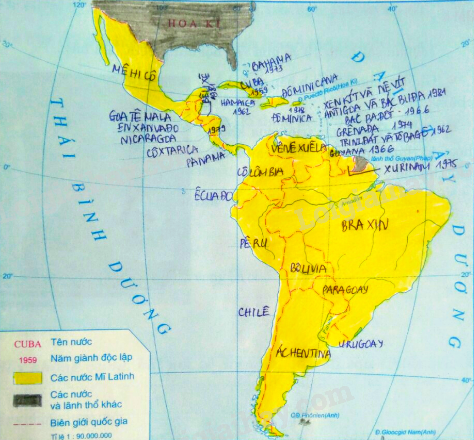 a) Xác định, điền tên nước, năm giành độc lập và tô màu vàng nhạt vào các nước ở Mĩ La-tinh