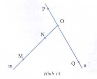 Cho hai đường thẳng m, n cắt nhau tại O. Lấy hai điểm M, N thuộc đường thẳng m sao cho đoạn thẳng MN không cắt đường thẳng n. Lấy hai điểm P và Q thuộc đường thẳng n sao cho đoạn PQ cắt đường thẳng m như hình 14. Có tất cả bao nhiêu đoạn thẳng ?