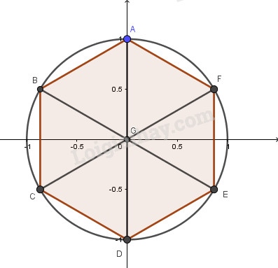 Xác định các số phức biểu diễn bởi các đỉnh của một lục giác đều có tâm là gốc tọa độ \(O\) trong mặt phẳng phức, biết rằng một đỉnh biểu diễn số i.